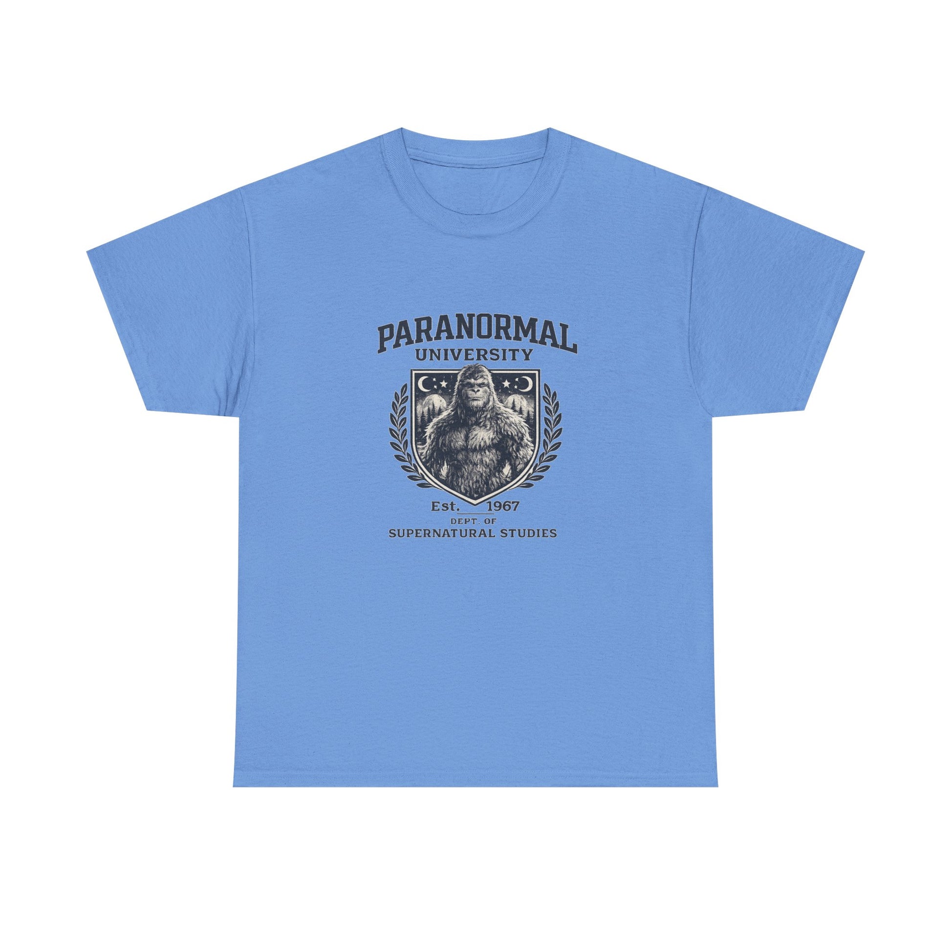 Welcome to Paranormal University, where the lectures are haunted, the finals are cursed, and the mascot definitely leaves 17-inch footprints outside your dorm at night. This vintage-style collegiate tee features our official cryptid campus representative — Bigfoot himself — proudly displayed inside a classic academic crest.