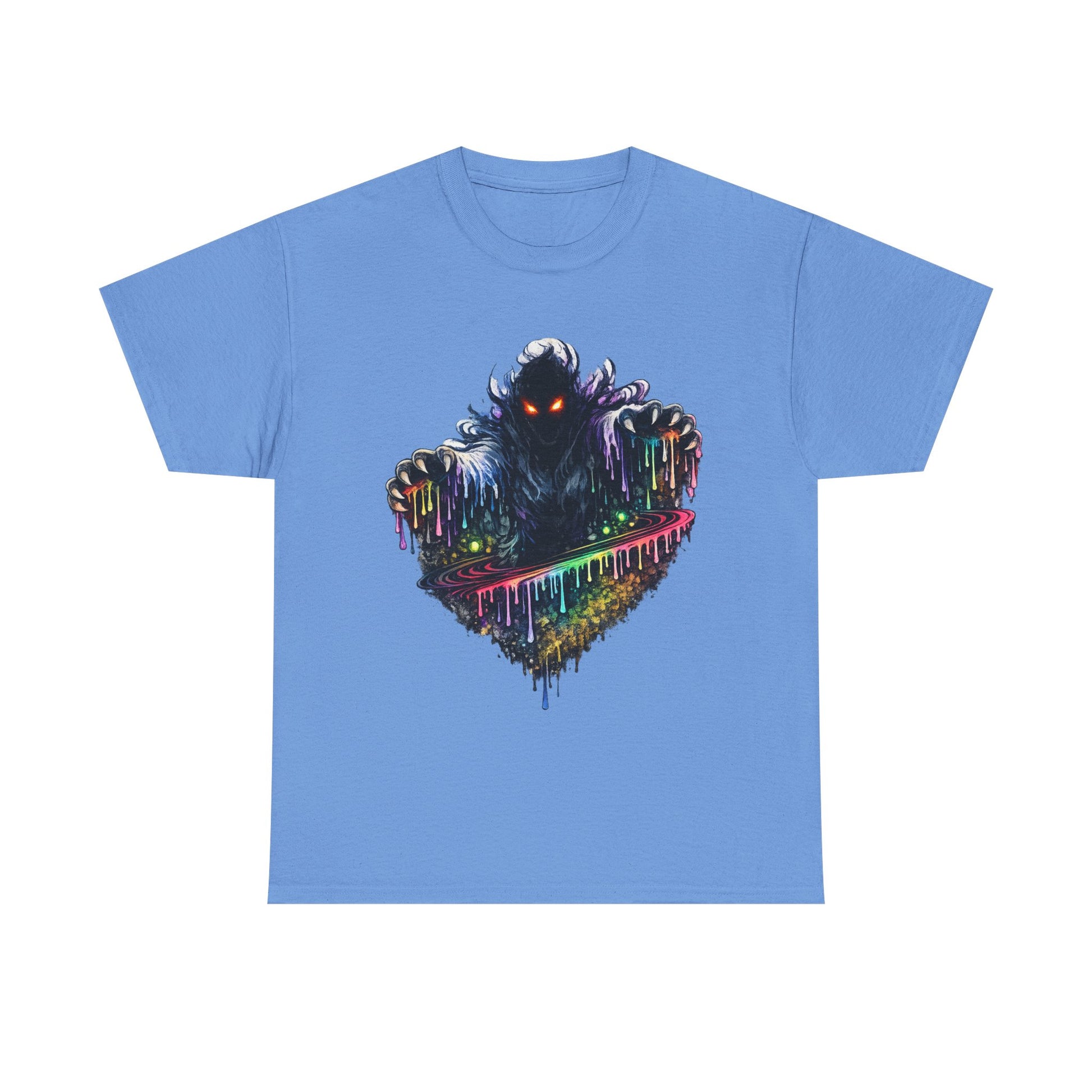 A bold, art-forward tee for anyone who loves dark fantasy and neon grit. The shirt shows a shadowy, hooded figure with glowing eyes emerging over a dripping, prism-colored landscape — like a mural come to life. Short, slashed brushstrokes and vibrant splatters give the design a sense of motion and danger. Wear it layered under a denim jacket for nights out, or alone to stand out at shows and conventions. The breathable medium-weight cotton and classic crew neck keep the focus on the artwork while staying comfortable all day. This piece vibes with urban street art culture and late-night wanderers who prefer moodier, expressive style.