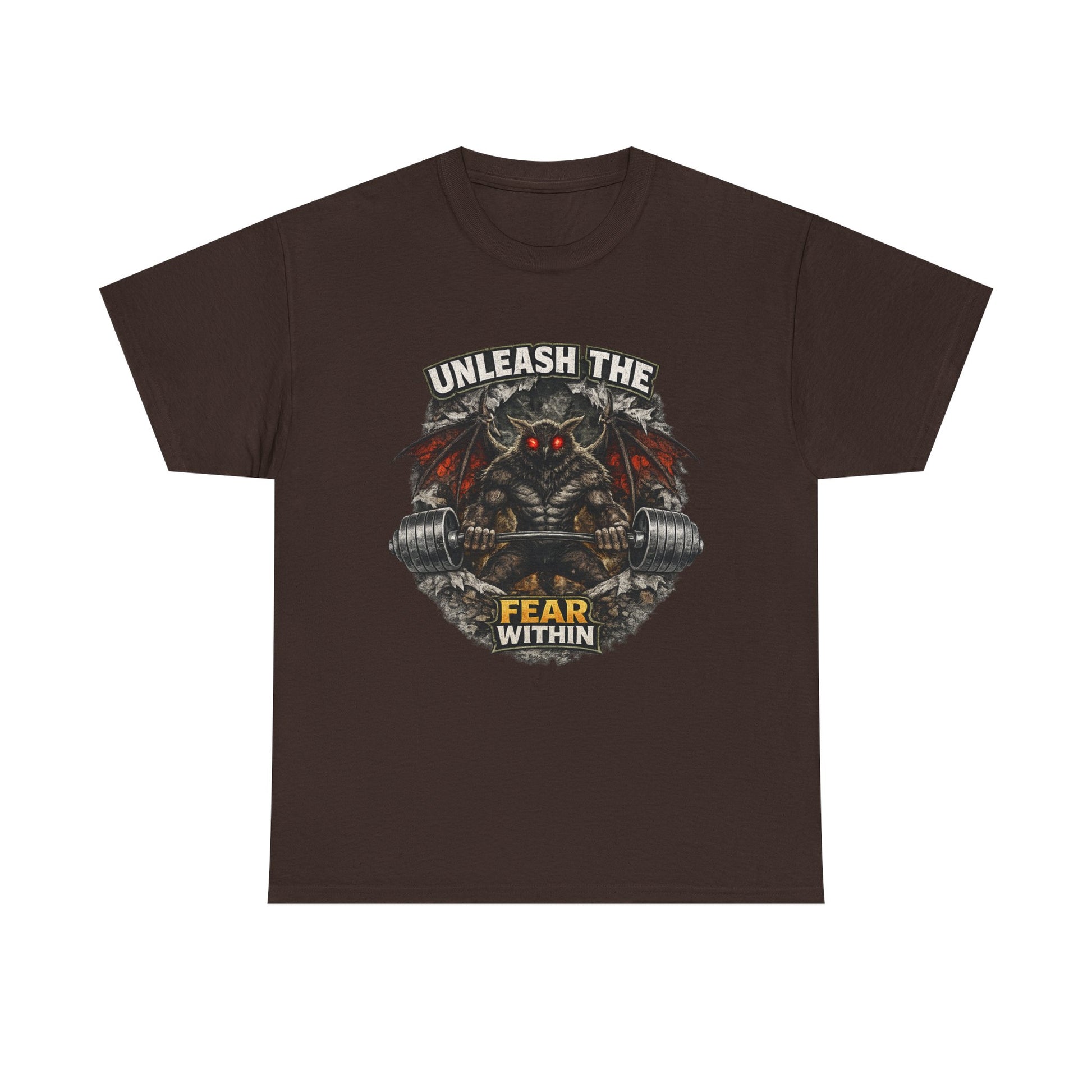 The Unleash the Fear Within tee channels raw, unsettling power with a monstrous Mothman mid-lift, glowing red eyes locked forward, wings spread, and stone cracking around him. This design is for those who thrive under pressure and push through the discomfort others back away from.