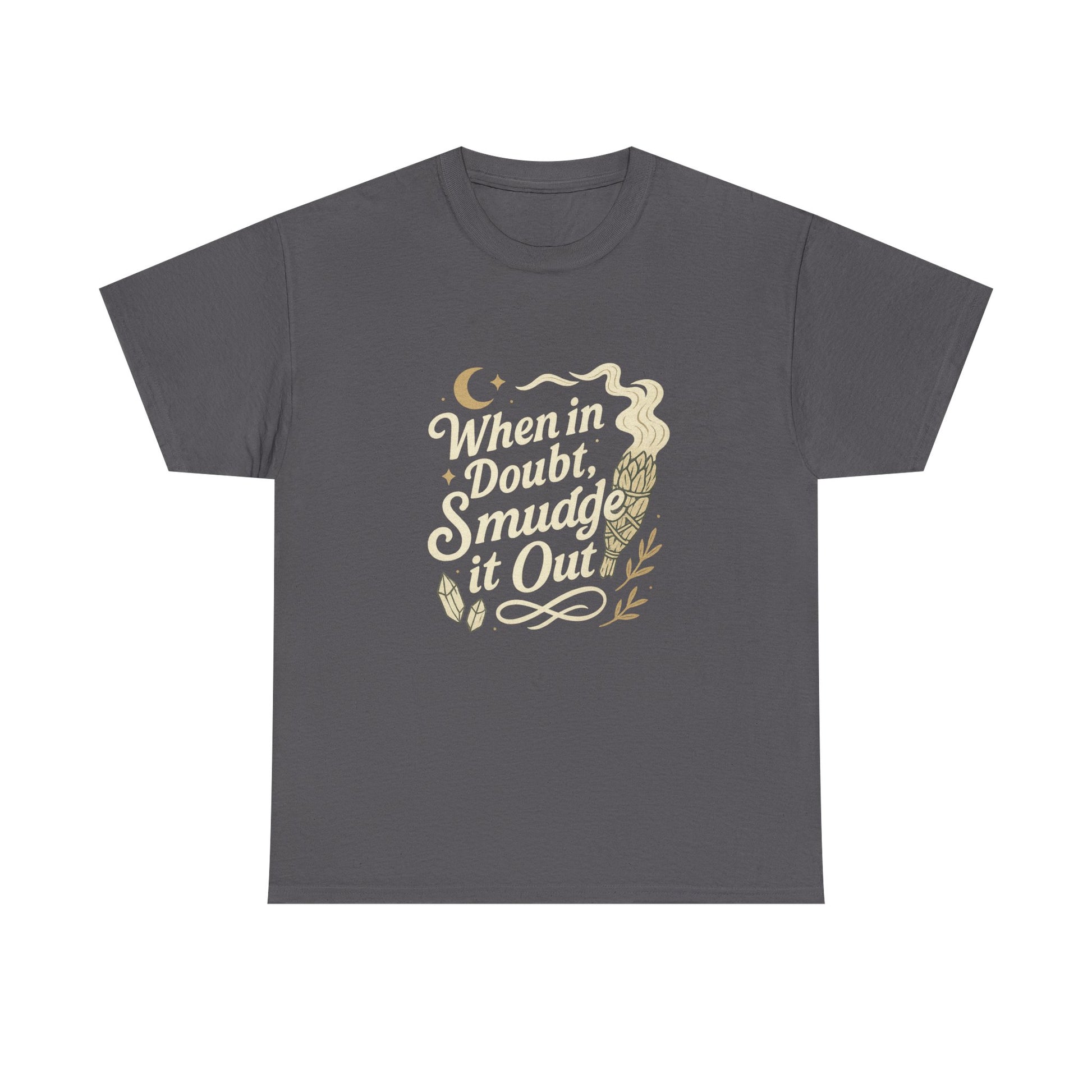 Cleanse the energy and serve a look. Our “When in Doubt, Smudge It Out” tee blends vintage hand-lettered typography with witchy iconography—crescent moon, crystals, botanicals, and a cleansing bundle—to capture that ritual-ready but coffee-shop casual vibe. Designed at Para Wear with best-selling witch / Wiccan / pagan aesthetics in mind, this graphic is balanced with bold keylines and photographs beautifully for socials.